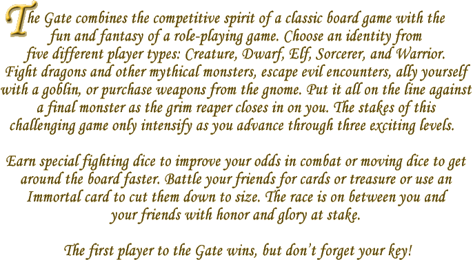 ©2003-2012 Oofdah! Games, Inc. All rights reserved. The Gate and A Game of Myth and Magic are trademarks of Oofdah! Games. All images and text on this website are subject to copyright. Items may vary in color and size from those shown. Website by MAGTYPE/CR